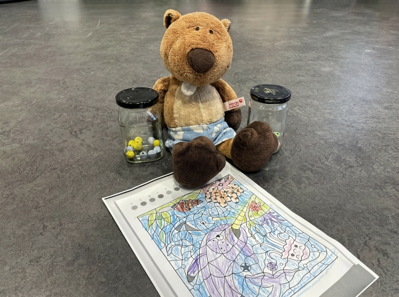 Heute wagten sich 39 neugierige VSC-Minis und unser Biber auf eine abenteuerliche Reise ins Land der Zahlen. Im Gepäck hatte unser Biber heute mehrere Gläser mit Perlen, die erst geschätzt und dann genau gezählt werden wollten. Was hat unser Biber gestaunt, wie gut, aber auch auf wie vielen Sprachen unsere Kinder schon zählen konnten. Ganz beeindruckt packte unser Biber seinen Rucksack weiter aus – hier gab es Unterwasserlandschaften, die je nach Zahl in einer anderen Farbe angemalt werden durften, Würfelbilder, die ihre zugehörige Ziffer gesucht haben oder Gegenstände, die gezählt werden wollten.